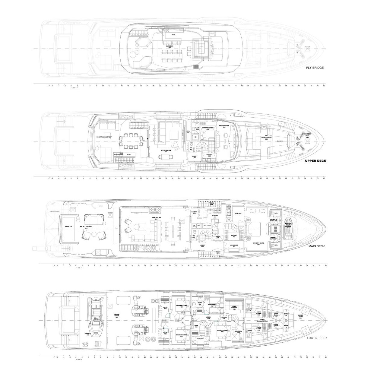 The Owner’s cabin is on the Main Deck and has two wonderful side windows (floor to ceiling) that ensure spectacular sea views and plenty of natural light inside the stateroom. Four guests cabin are located in the lower deck.