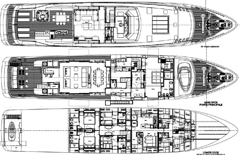 The yacht features a full-beam master suite on the main deck, forward. The Owner’s suite offers a study and a seating area, the main bedroom, a dressing room and an en-suite bathroom complete with a ‘wellness spa’.