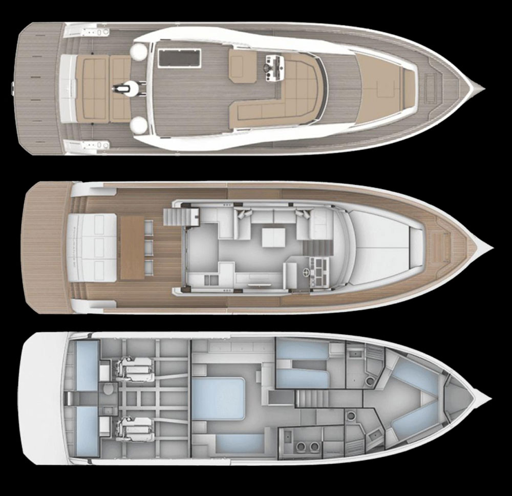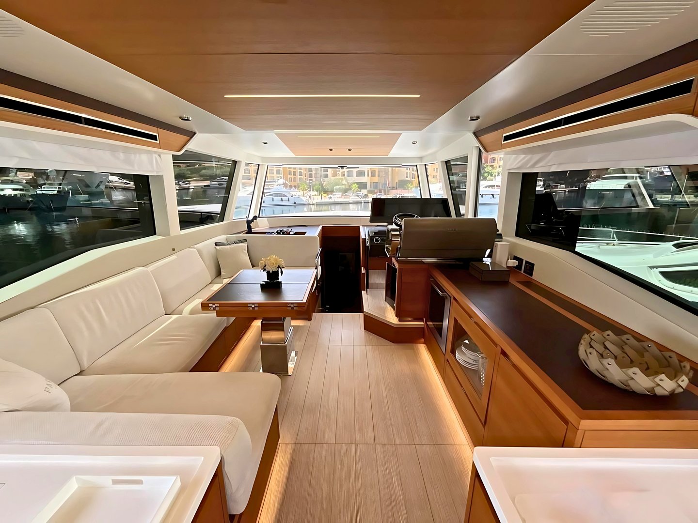 Owners central cabin with double berth , sofa and en suite head with wc, washbasin and separate shower Lower helm station to starboard with access door to side deck