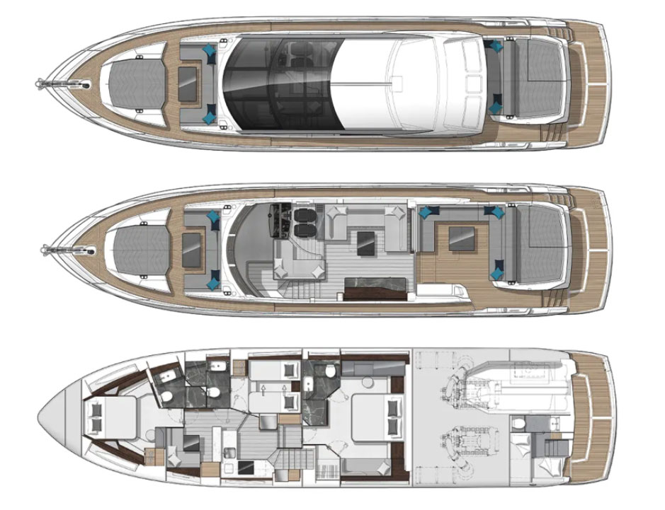 Superb fitted out cockpit with large sunbed, u shape sofa with table, saloon with 2 seating areas and table, complete helm station and above large openable hard top with glass. Bow area with seating, table and sunbed. Lower deck there mis the galley and seating area with table in front of wall mounted tv. Accommodation for 6 guests in 3 cabins all ensuite. Doble crew cabin and garage accommodating tender.